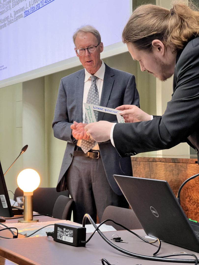 The opponent, Dr. Piet Stammes from Royal Netherlands Meteorological Institute, probed Antti’s knowledge thoroughly. Among many insightful questions there was also a live experiment! That is a rare feat in mathematical PhD defenses. Antti managed to pass the test of using a linear polarizer to analyse light reflecting off a “snow phantom”, a plastic bag on the table.
